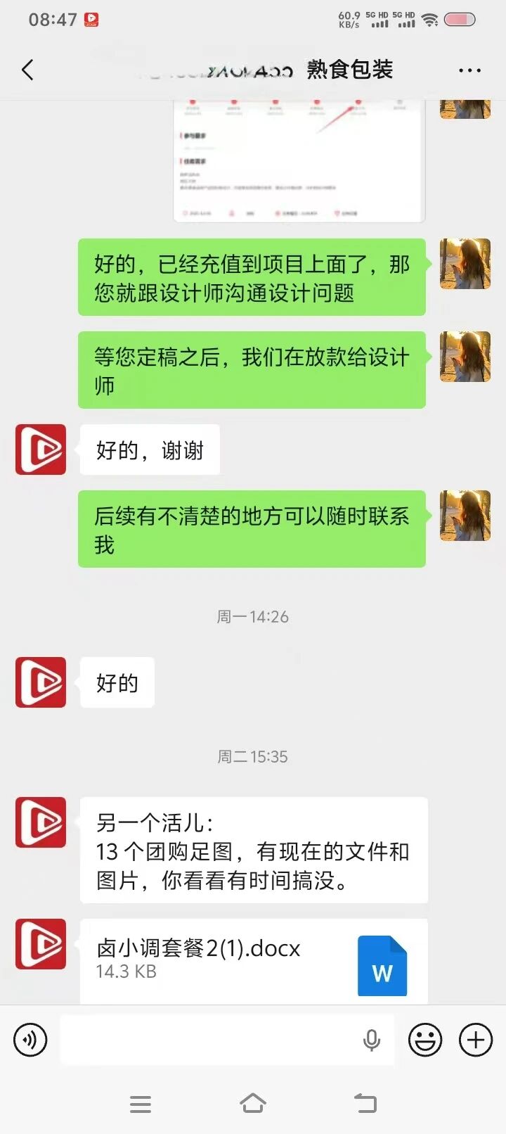 在品牌视觉形象日益重要的今天,专业的包装设计与视觉呈现成为企业开拓市场的关键。田总与一品威客平台的合作故事,完美诠释了专业服务平台如何通过高效、可靠的服务赢得客户的深度信赖——从最初的熟食包装设计需求,到后续连续发布的主图设计、长图设计项目,短短时间内三次合作的顺利完成,充分展现了一品威客对企业设计需求的快速响应能力与优质服务水平。